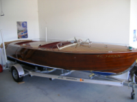 This boat "Putt Putt"was purchased by me in 1990 and went through an extensive restoration at that time that included a complete new West System Epoxy encapsulated marine plywood bottom to make it lighter and non-soak so it could be trailered easily. The engine was completely rebuilt with new crankshaft, pistons, gaskets, seals, etc and modernized with the addition of a 12 volt electrical system, oil filter, oil pressure safety switch, electric fuel pump. The chrome which is complete was re-chromed professionally the same year. In addition a center mount auto bilge pump was installed. New upholstery and complete new varnish in 2021. Awesome little boat!! We used this boat approx 2-3 weeks a year until about 1995 and then was used very little for the next 26 years but was kept in our garage under cover. In 2021 my daughter wanted to use it as part of her wedding so the varnish was redone (14 coats) and the upholstery was redone and I pulled it 1100 miles to Maine for the 3 weeks we were there. It ran perfectly and is now back in our garage in NC. My estimate is that it has probably has less than 200 hours use since the 1990 restoration. It is a beautiful very functional craft that is great for family activities with the open back which makes it a great watersport boat for skiing, tubing, etc. Carries up to 5 people and I love skiing behind it. The boat came from Lake Lanier in SC originally and I used the boat on Lake Keowee in SC mostly and spent several weeks on Lake Webb in Maine 2 different times. It has always been trailered since I owned it. This boat needs nothing currently except for love and care and routine maintenance. Thank you.