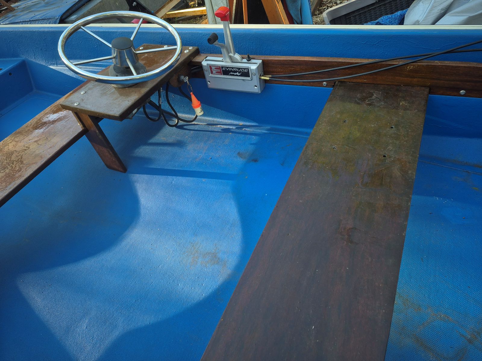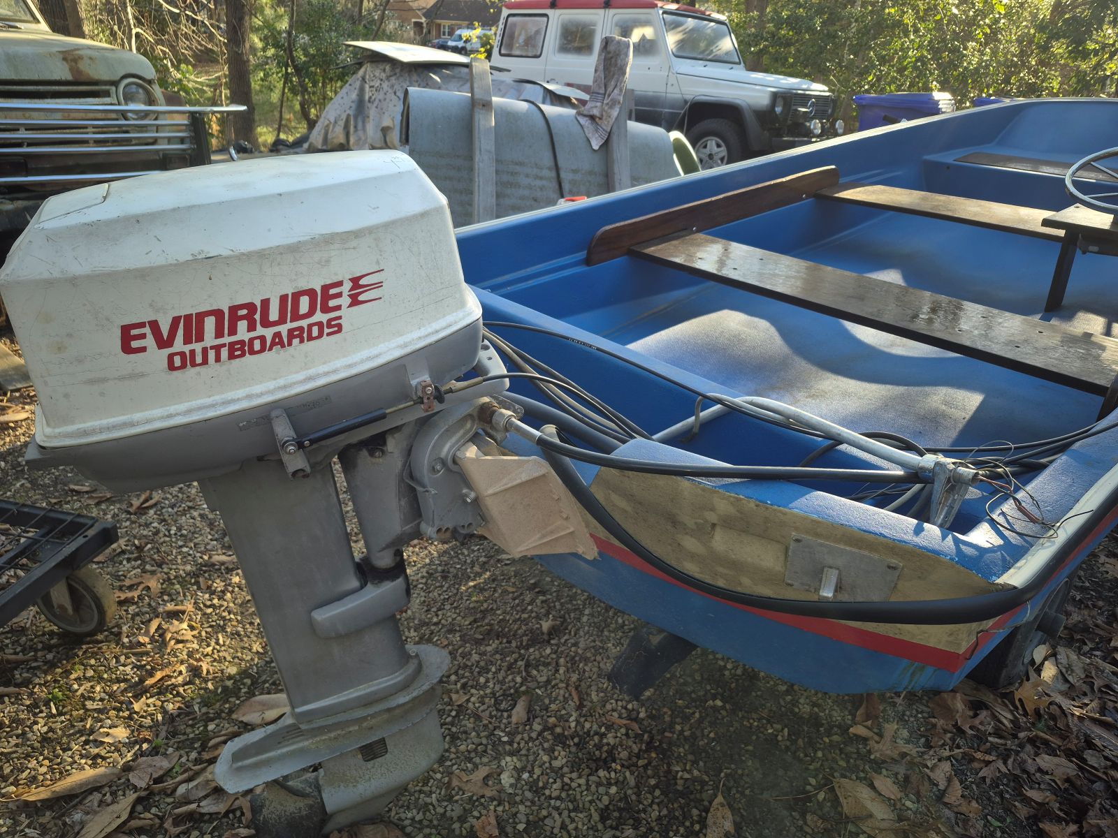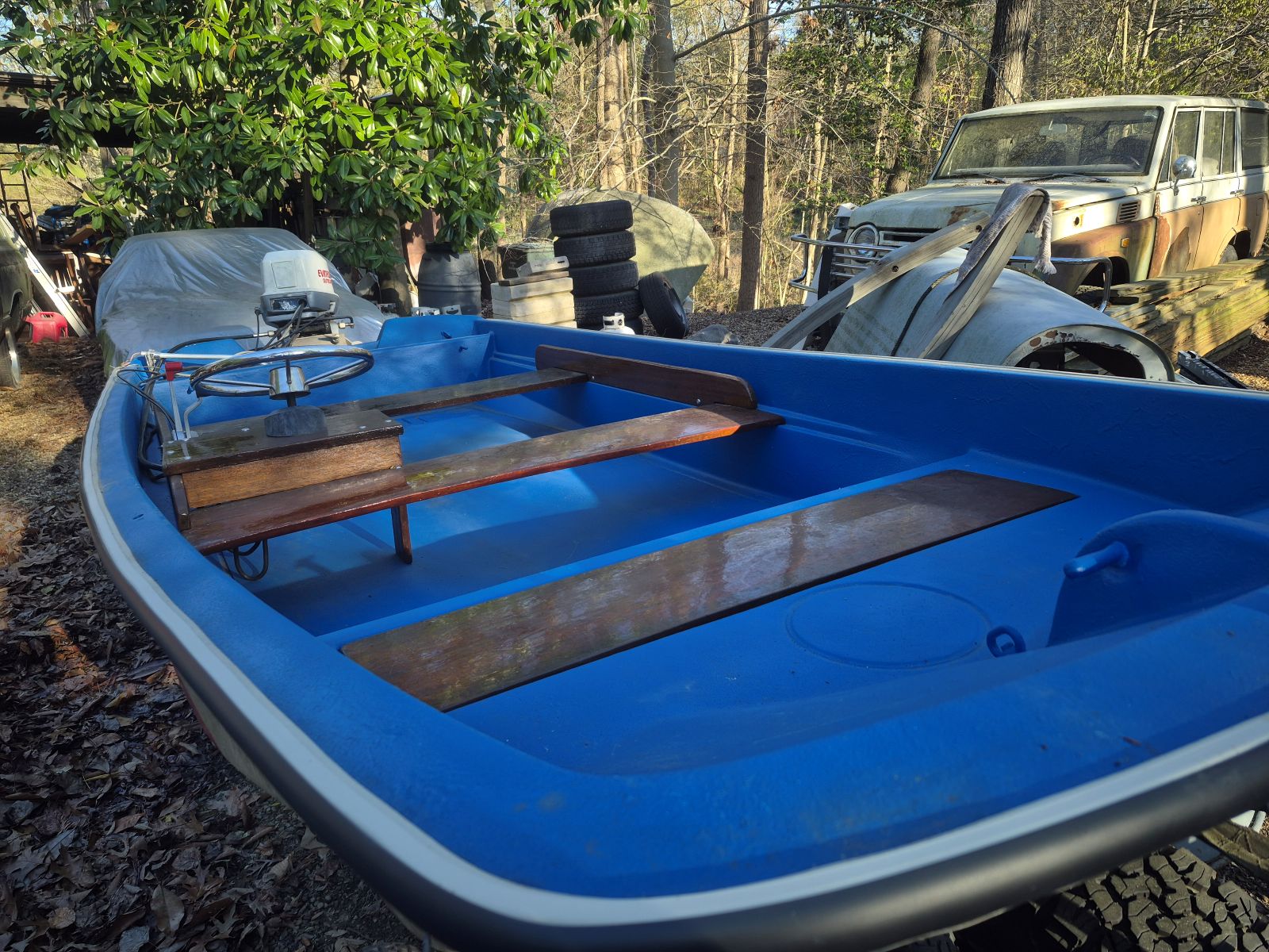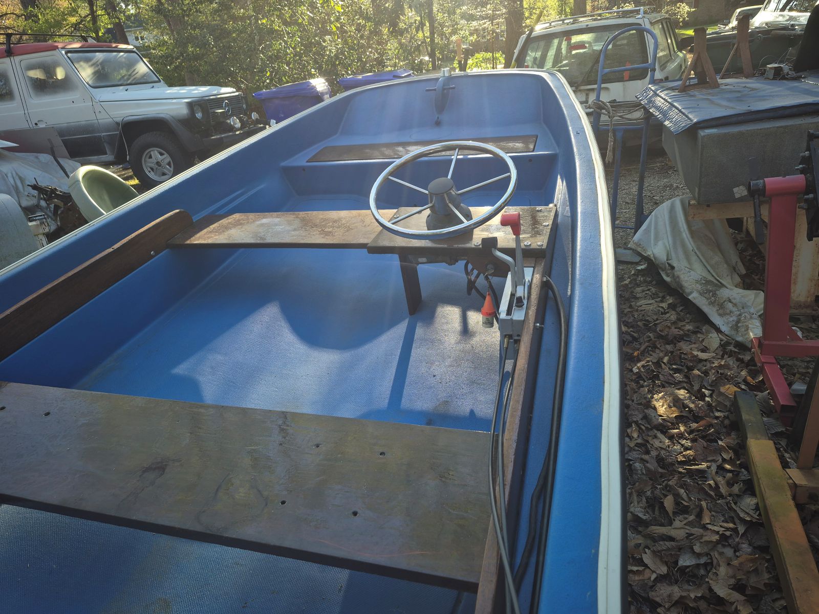 Restored hull with fresh bottom paint and blue bedliner on inside. Motor refreshed with NOS controls and cables. Galvanized trailer with new tires