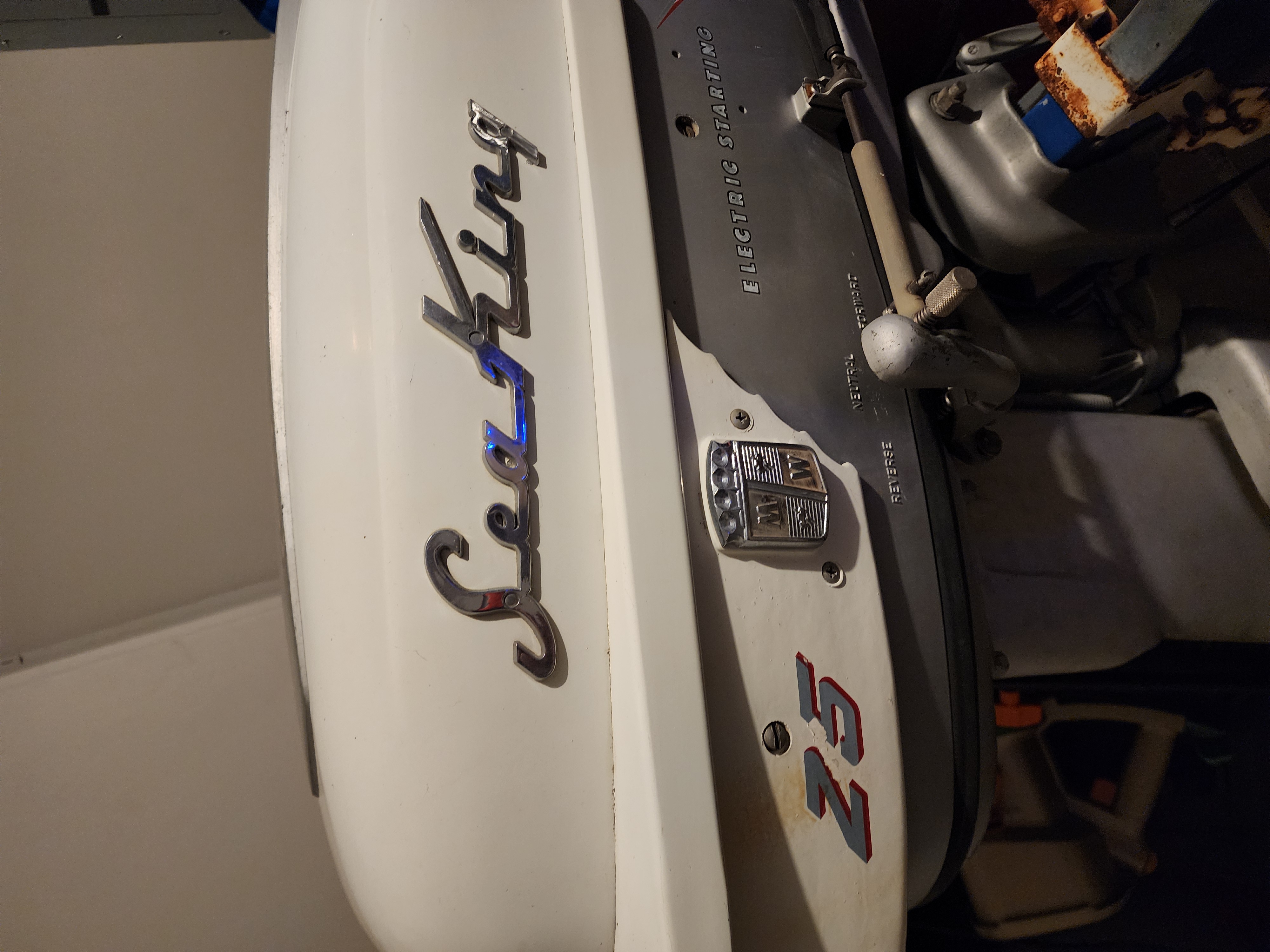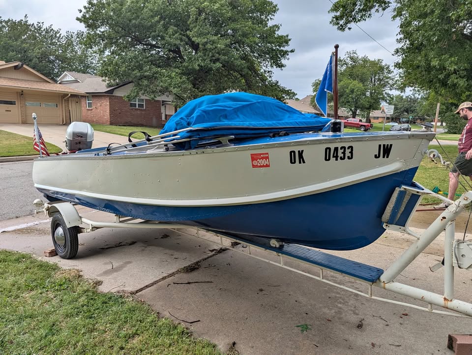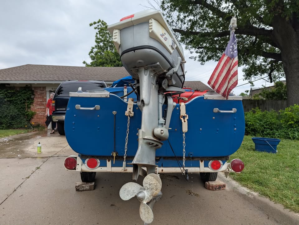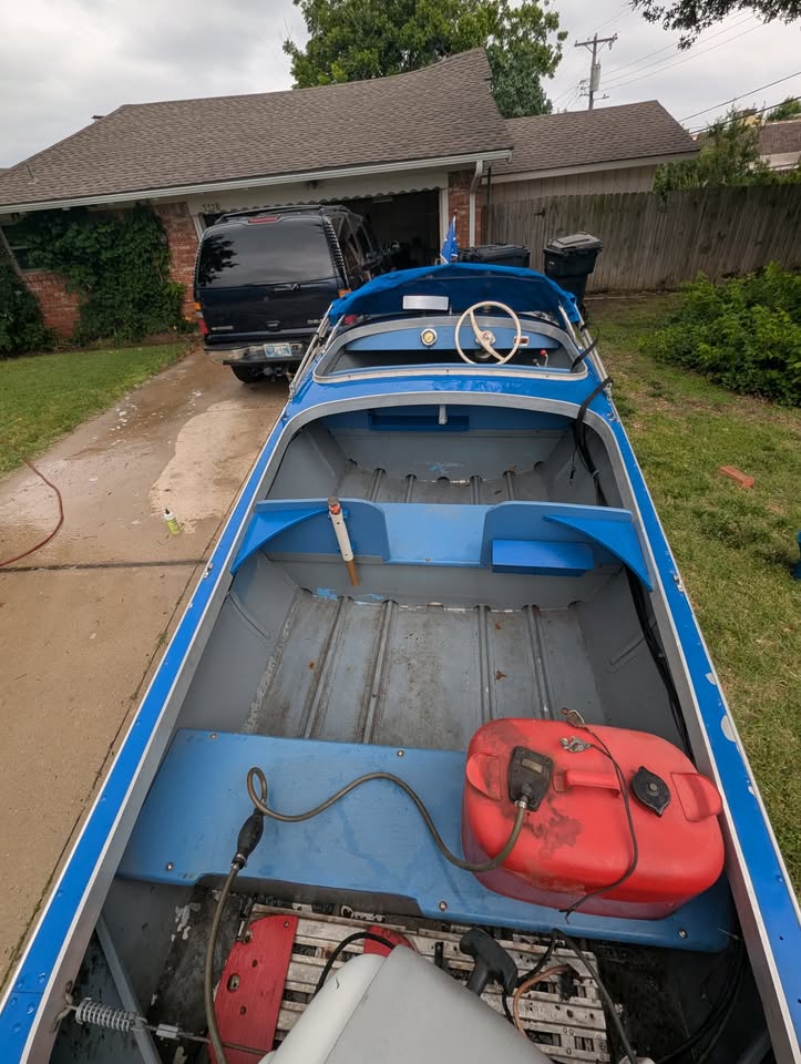 Ran and drove fine 20 years ago and has been garage-kept since then...with no attempts to start it since then. Paint on the outside still has good sheen/film build with an area a few square inches on the upper surface (gunwale?) where adhesion has failed and another scratch about 8" which might buff out. Interior paint is intact in most places, worn in others with surface rust in 2 or 3 spots. New tires with lifetime service warranty purchased a few weeks ago (visible in one picture; most pictures feature the older tires). My lack of knowledge is evident and most of my experience with this boat is second-hand (other than hauling it across town and putting the new tires on it).