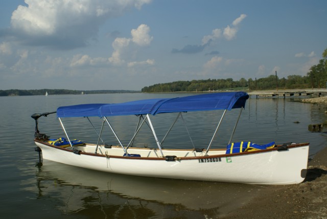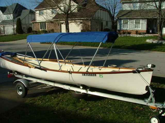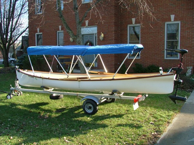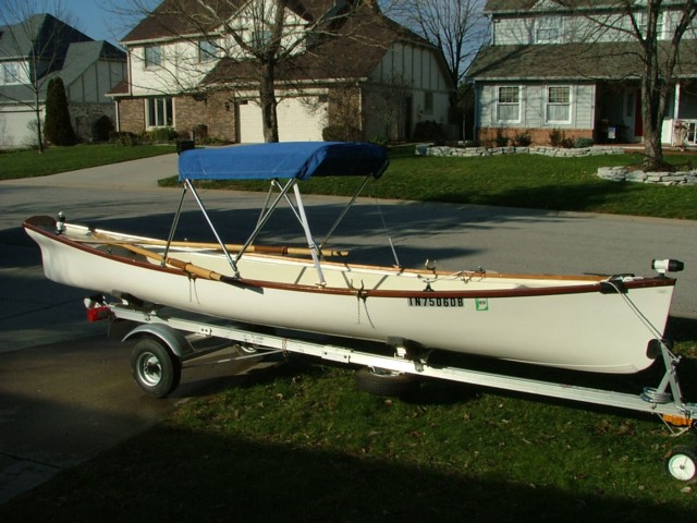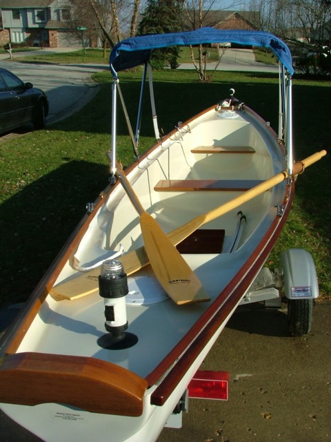 Fiberglass/mahogany classic-design skiff is 2 years old and like new. Numerous added equipment: 2 pairs Shaw & Tenney spoonbill leathered oars, Minn Kota Endura Pro 55 lbs. thrust electric motor, West Marine deep-cycle battery, 3-piece convertible top, trailering/storage cover, navigation lights, aluminum trailer, and more. Marine bronze hardware. Stainless steel fasteners.