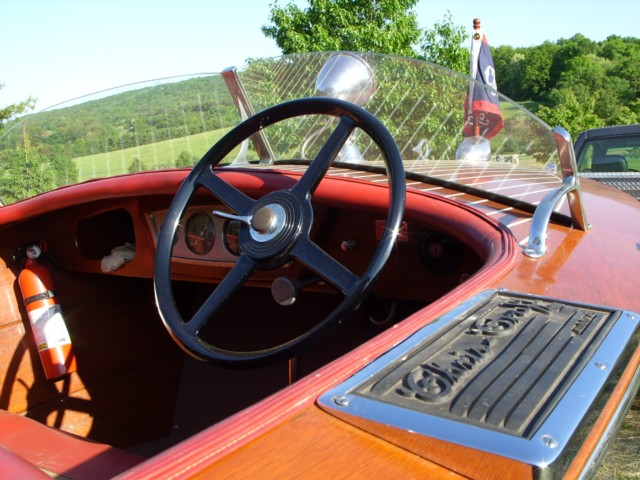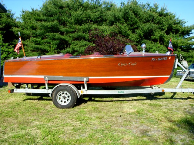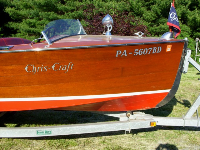 This 1937 Model 720 Deluxe Runabout has been completely restored and is in excellent condition. A total of 529 of these boats were built between 1937 and 1939. Nice upholstery, gauges, and chrome. Complete with a single axle Load Rite trailer.