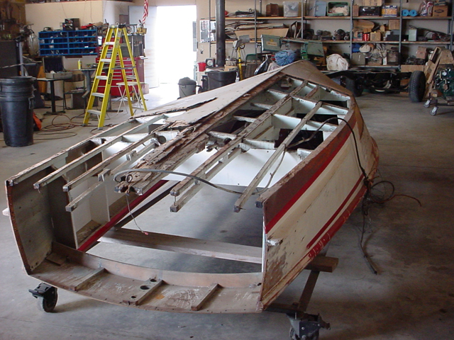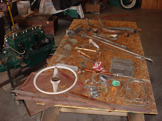 The engine is rebuilt and has not been started. There is a lot of rotten wood on the bottom of this boat. I believe it is complete. Extra drive shaft and props. This would make a nice project for a wood craftsman.