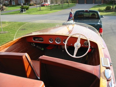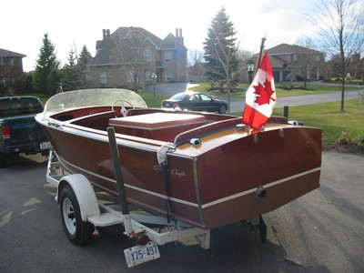 This boat was purchased in California, in 1998 from the second owner. It was later container shipped to Canada in 2001. The boat originally came from Lake Tahoe, then later to Sacramento. The boat remains in good condition and the engine has excellent compression on all cylinders. The engine is the original Chris Craft KFL 131 hp 6 cylinder with twin carbs. All hardware appears to be original to the boat. The bottom is ready to be recaulked and repainted. The upholstery is original, but a bit faded. It has a bimini top, trailer, life vests, all accessories, and a transom mounted boarding ladder. It also has a custom tonneau cover. There is no epoxy on the boat, but has Chris Craft Copper Bronze bottom paint, Interlux Chris Craft Mahogany filler stain and 10 coats of Interlux Schooner Tung Oil Varnish.