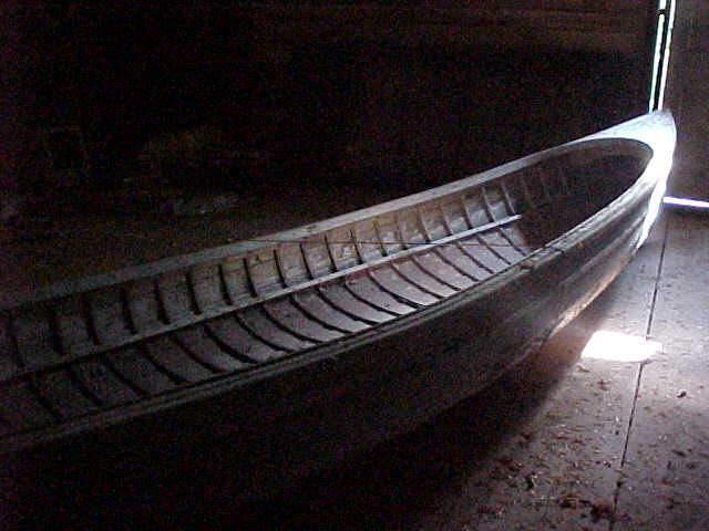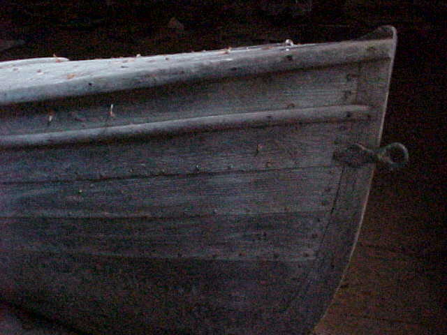 This boat was purchased by its current owner at an Antiques show three years ago. It is believed to have come from the Clayton area, but the builder is unknown. It is 90% complete and weathered, but is very restorable. Some planks need repair or replacement, but the boat is very complete. Offered at No Reserve.