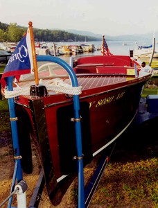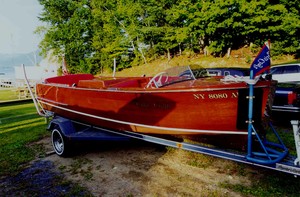 This Chris Craft Deluxe Utility has it's original Model K, 95hp, 229.7 ci, 6 cylinder engine. In the winter of 2001, we had the engine completely taken apart, cleaned, cylinders rebored, and otherwise completely restored and polished. All mahogany wood was out and the interior mahogany was recently restored and is now excellent. It has red upholstery in excellent condition with removable cushions front and back Step pads (Chris Craft) on each side. 2004 dark green canvas cover custom fitted to the boat; Chris Craft Flag for bow; Stern light on flag holder with American flag; Lights-red & green running lights and a search light; Horn and anchor with line.