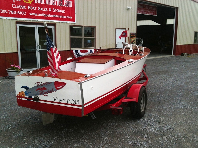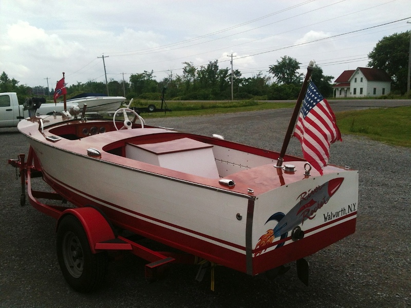 This is a real sweet heart - an original Rocket with original bottom, sides, and engine. The boat has new decks and a very nice finish. Sitting on a nice home built trailer.