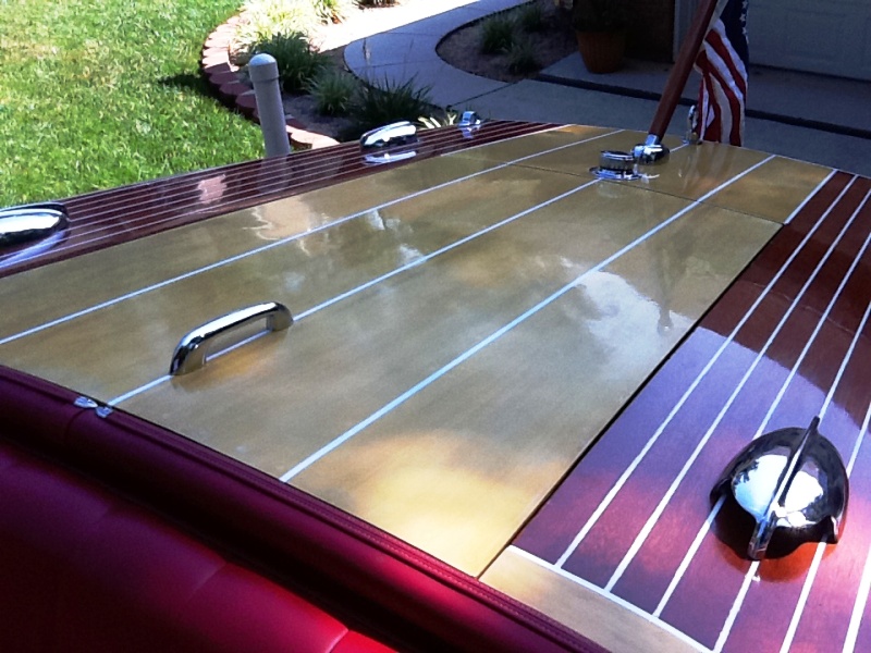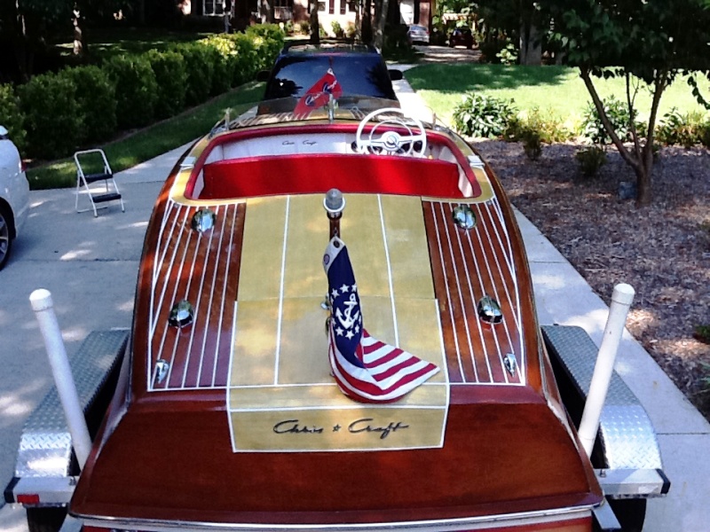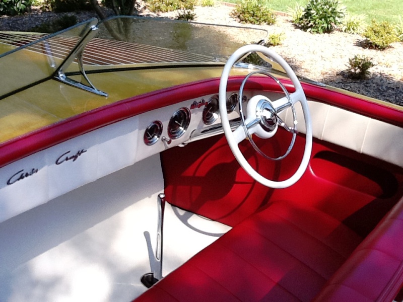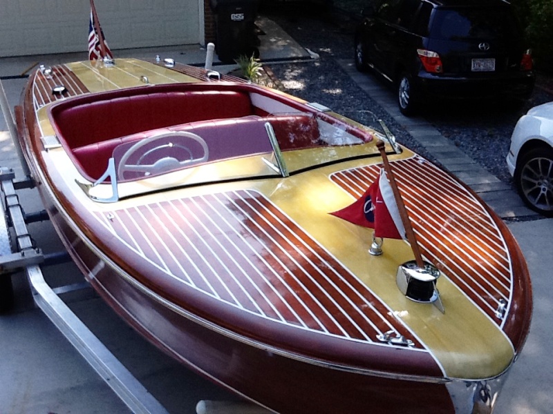 New 5200 bottom Original hardware re-chromed ¼” diagonal first layer bottom planking (original style) ½” 20’ planks used for outer planking New topside, decking and transom planks All planks bedded in 5200 sealer using 2 coats of CPES Rudder stuffing box resealed Shaft log resealed with new hose and clamps New shaft and rebalanced prop New strut bushing Rebuilt original KLC New transmission seals and bearings and new shaft coupling New motor mounts Electronic ignition module in distributor for original look New high energy coil Rebuilt starter, generator, water pump, carb and fuel pump All new original type wiring, switches and fuse panel Rebuilt and re-chromed original gauges New tachometer drive cable New Willard 6V battery Original style upholstery- marine grade-red & white Original style white floor mat material New stern pole with light and American flag. New bow pole with pennant flag New safety glass windshields.