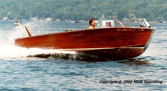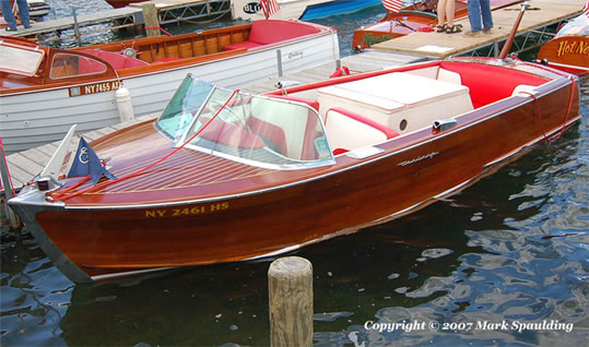 Lower transom and interior were replaced in 1988. A new 5200, plywood and canvas bottom (Chris Craft style) was installed in 2000. The upper transom and a few side planks were replaced in 2007. The boat has 2 coats of fresh varnish and fresh bottom paint. The water pump has been recently rebuilt. Flooring was replaced last year. Speedometer, tachometer, and clock have been rebuilt. The chrome is original but still in reasonable condition. Comes with a Shorelander trailer equipped with guides and a skeg protector. New battery June '08