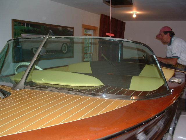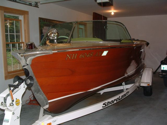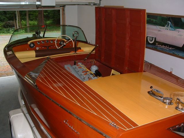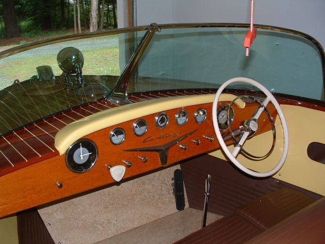 This is a terrific ski boat, wonderful cruiser, and one of only 41 Arabians built by Century in 1957. It has been professionally restored throughout and is ready to go: new epoxy bottom over all new frames, new decks, new A & A upholstery (original colors), new flooring, fittings rechromed, restored gauges, and a beautiful finish. Original dual carburetor Chrysler has been rebuilt and new CGA gas tank, wiring, fuel and oil lines installed. New Shoreland’r single axle trailer included.