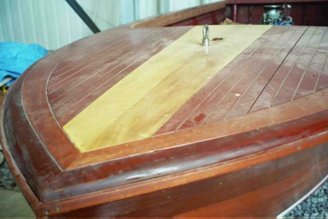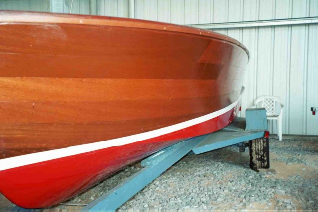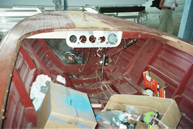 Hull CL-18-1045. Engine number 812014. Location Ft. Walton Beach, FL Original engine restored 2002 by Hinds Automotive. Transmission appears to be in good order. Hull restored by Obexer's, Lake Tahoe, 1999-2002. Bottom is glassed. Transom, deck, covers, rails and sides have new mahogany, light varnish coat. Bilge is painted red. Original propeller, rudder, linkage, steering column & steering gears, & bilge pump in good order. To be done: Instrument panel and some instruments included but need restoration. Wiring harness intact but not wired to engine, lights, or controls. Interior - seats, upholstery, engine box are missing. Original chrome windshield frame is intact, rubber seal & plexiglass are missing. Original chrome lettering, light covers, vent covers need replating. Steering column and gears work, original steering wheel missing. Shifter unattached. Gas tank original, unrestored, no visible leaks.