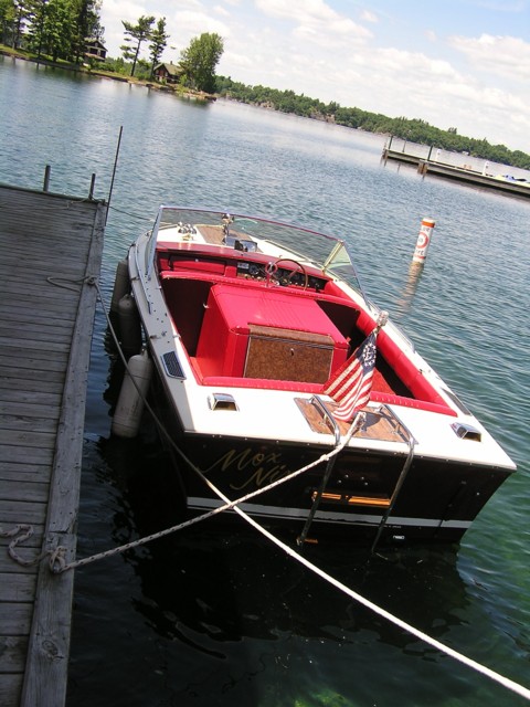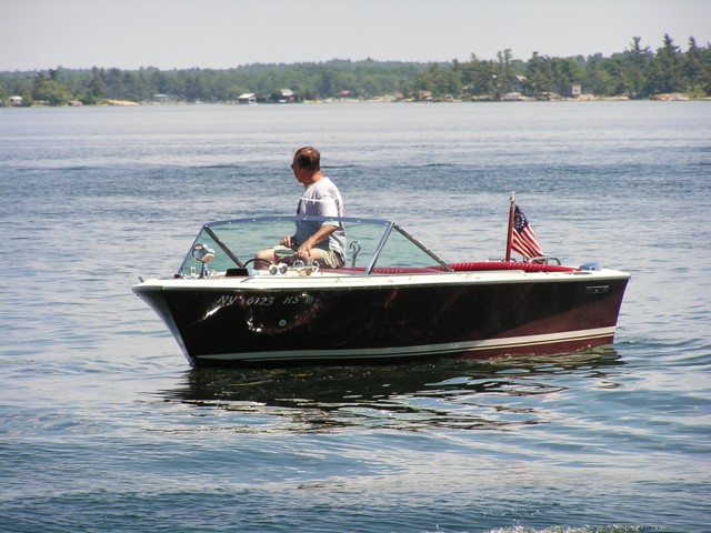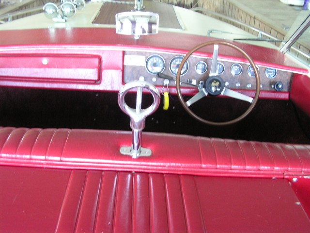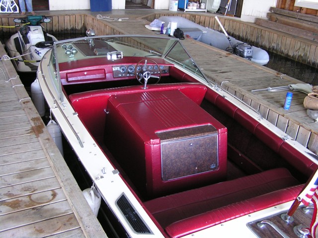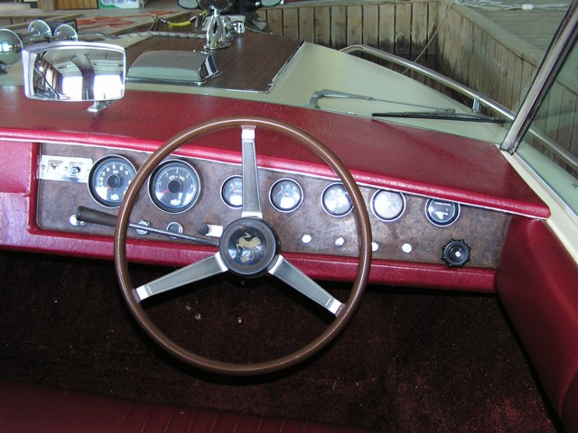Second owner, original 340 Chrysler 250HP engine with 460 fresh water hours. All gauges are in excellent condition. Column shift with neutral light on dash. Aircraft throttle. Factory spotlight, boarding ladder, beverage holder. Through hull exhaust at the water line for that classic inboard sound. Runs, looks, and sounds great.