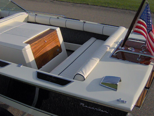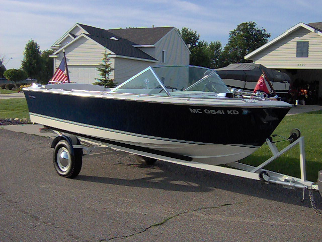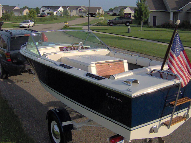 1975 17' 7" Century Resorter. Completely Restored. Have full photo album of restoration process. Has original Chrysler 318 marine engine that runs great. I restored this boat in summer of 09 through spring of 2010. I used the boat last summer at our cottage and it worked great for tubing and wakeboarding. It is a show quality boat and gets more compliments than any other boat that I have owned. Has new factory interior made by an original Century upholsterer at A & A marine in Manistee, MI. Trailer was blasted and painted same colors as boat. Has new winch, tires, bearings, bunks, and lights. I believe it is a correct craft trailer from same era as boat.