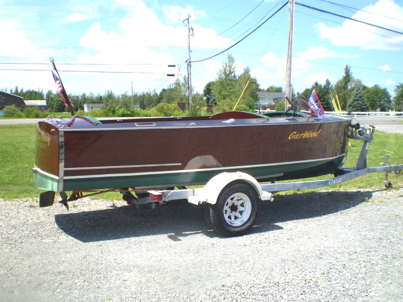 Fresh restoration of a beautiful Tucotte Gar Wood. Four cylinder Marine Power engine zooms this little darling to nearly 40mph. Excellent chrome, upholstery, new flooring, Venture aluminum trailer & boat cover included. Fresh water Brandt Lake boat!!!