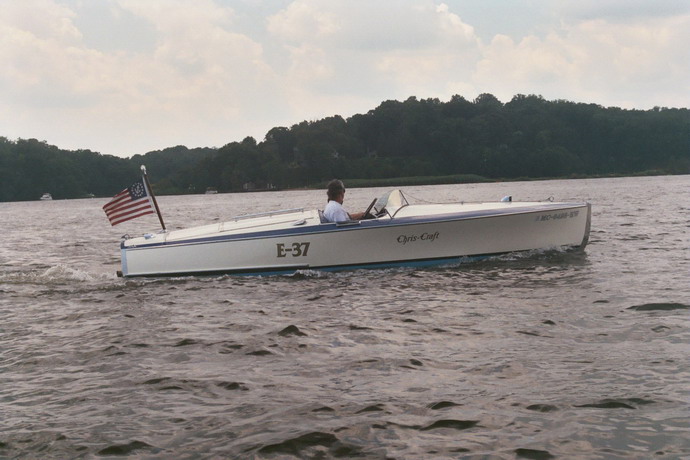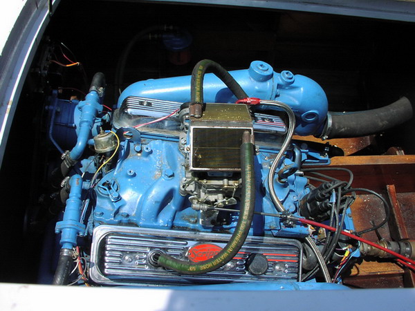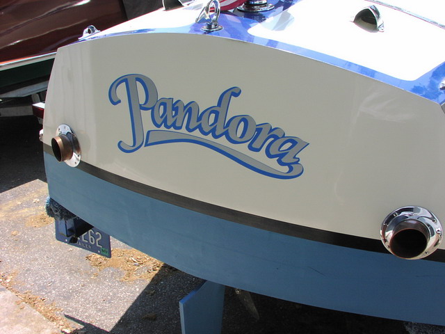 Not to be confused with the much more common “Racing Runabouts” built from 1948 through 1954, Model 517 Special Race Boats were true race boats built light and run hard. As a result, few authentic examples have survived. Pandora is a meticulously executed reproduction, built in Australia, and finished by New England Boat and Motor. Identical in appearance and performance to her pre-war ancestor, she incorporates the finest in modern technology and craftsmanship. Her hull is constructed of cold-molded marine plywood and Philippine mahogany totally encapsulated in epoxy resin. Her bottom is sheathed with two layers of fiberglass cloth and she is beautifully finished in blue and white Awlgrip. Powered by a 300 hp 350 c.i. Corvette V8 from the GM Hi-Performance Division, she easily (and reliably) equals the race performance of her predecessors.