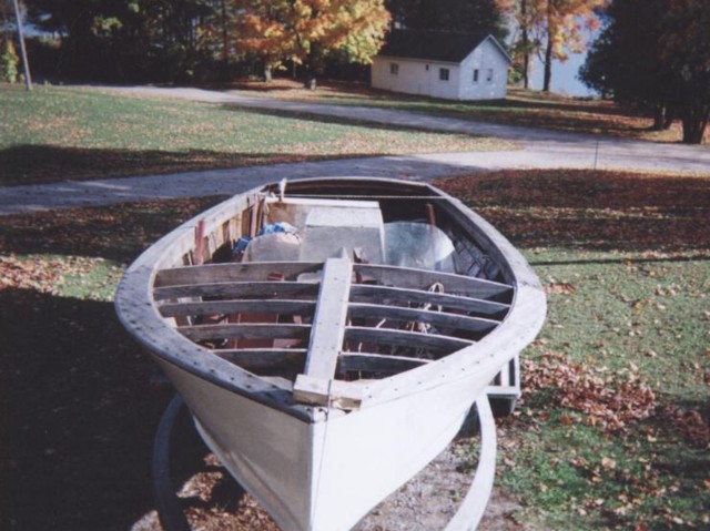 This boat needs a considerable amount of restoration but is generally complete except the mahogany planking on the front deck was removed and discarded prior to my purchasing boat. It is any easy boat to work on because it was built batten style. Plywood sides, one soft spot in the keel. This boat has very nice lines. Although not shown in the photos the owner has the cutwater, seat framing, interior side walls and 2 windshield brackets. The steering wheel and gauges are absent from the boat. Fine Canadian craftsmanship have made this boat very popular here in Ontario.