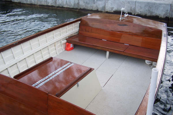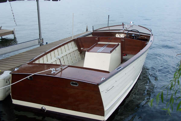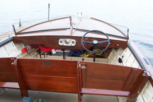 Restored within the last few years - painted Hateras white, mahogany decks and seats. 10 coats of Epifanes varnish. 1/2" cedar hull is all original. Changed to 12 volt system. Chris Craft style 3 piece glass windshield. This is a fantastic user utility and one of the most affordable ways to get into wooden boating!