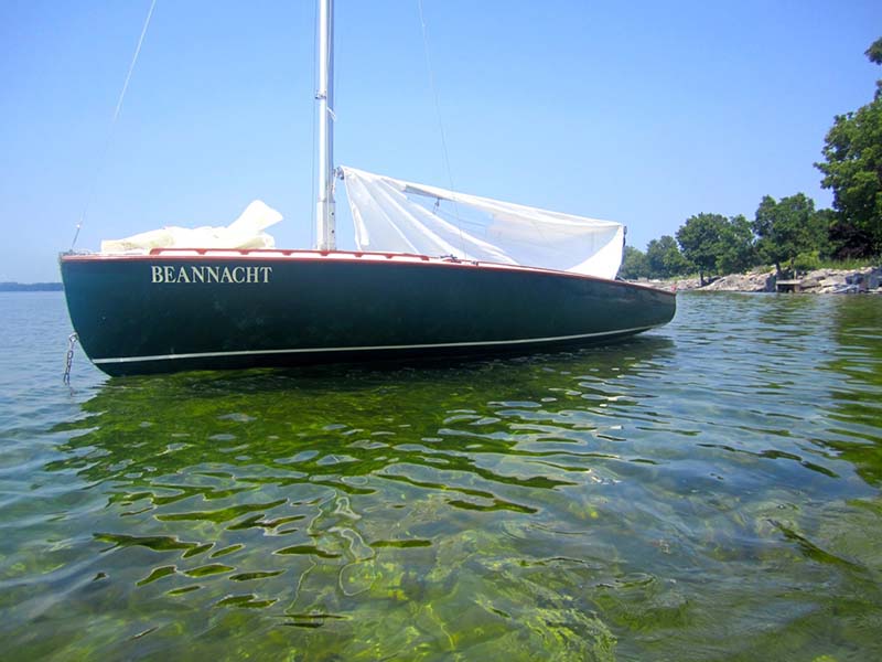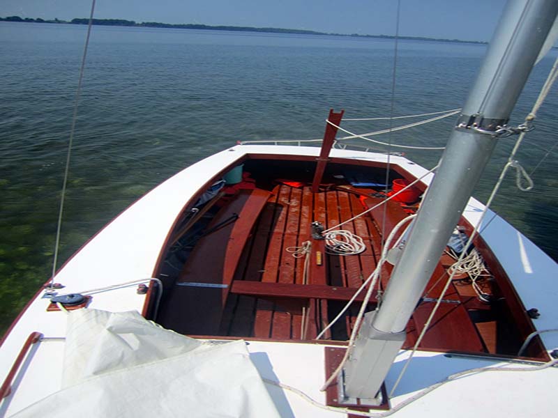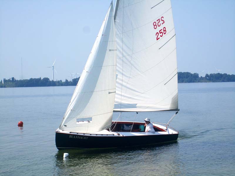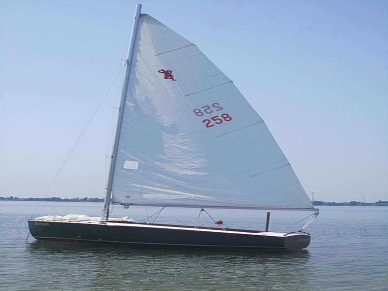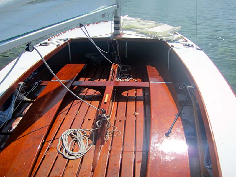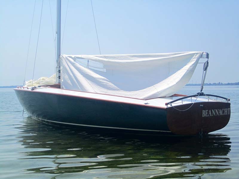 This beautiful day sailer is built of molded mahogany marine plywood with varnished mahogany trim and interior. She has undergone restoration which includes updated hardware, sails, , and fiberglas sheathing of the hull. workmanship on the restoration was of superior quality. She comes with Boston sails, spinnaker, full canvas cover, boom tent for camping and 90 pound lead in centerboard. Additional heavy weather sail included.