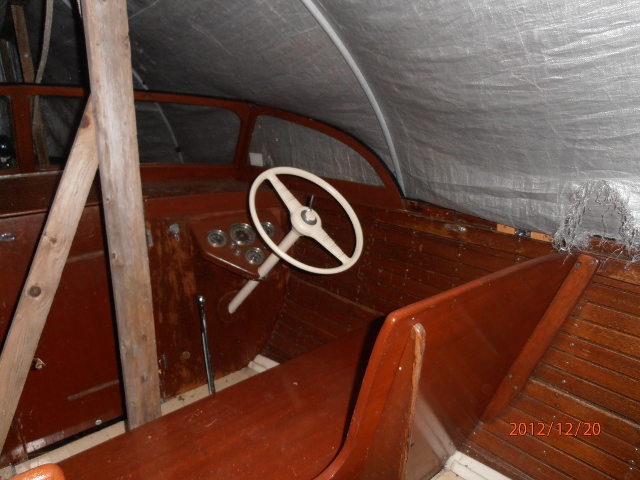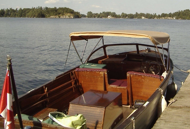 Owner states that there are no leaks and no rot. Boat is very original with some ribs replaced. Starts and runs excellent, 6V with 6V/12V starting. Used as daily driver/island boat in the 1000 Islands. Complete with factory build sheet. Needs sanding and varnish to look good.