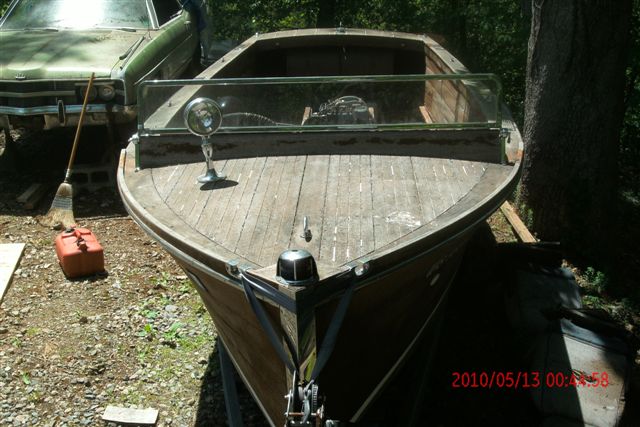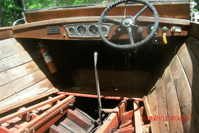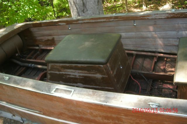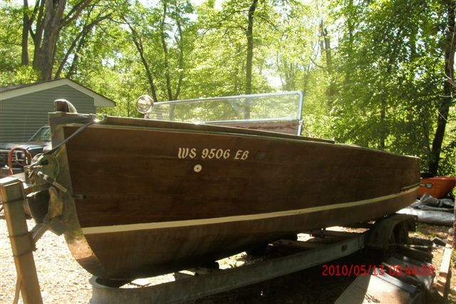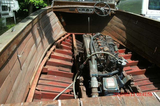 Hull #35402. Boat seems to be in an easily restorable condition. Chrome is good, stem & side planking seems to be in very good condition, front deck seems to be original and very restorable, original horn works and original spot light, Original Interior: I only have the back of the rear seat and it needs upholstery, has the original walk around front seat with original springs, also needs upholstery. Has optional fishing box behind front seat. Currently has a running 100 HP grey marine flat head 6, boat originally had a K motor. The keel & ribs and diagonal planking seems to be in good condition. There is one spot on the starboard side (midship) that may need repair. The bottom was fiberglassed. Engine stringers need repair. Rear deck & transom could use to be replaced, has 1 rot spot on each side by spray rail transom. Tandem Trailer included in good condition.