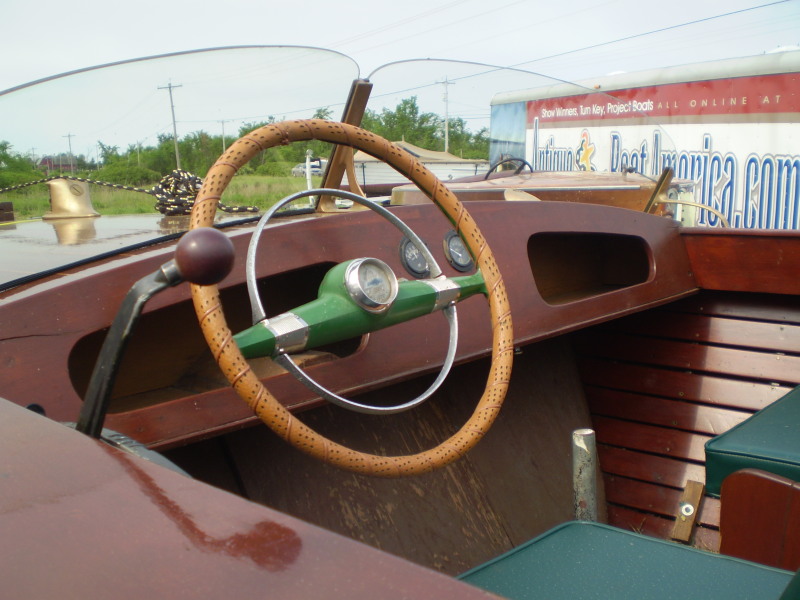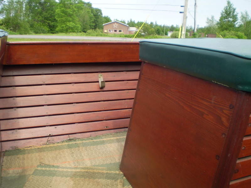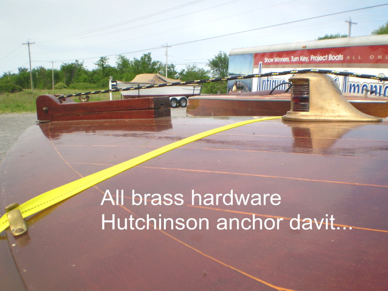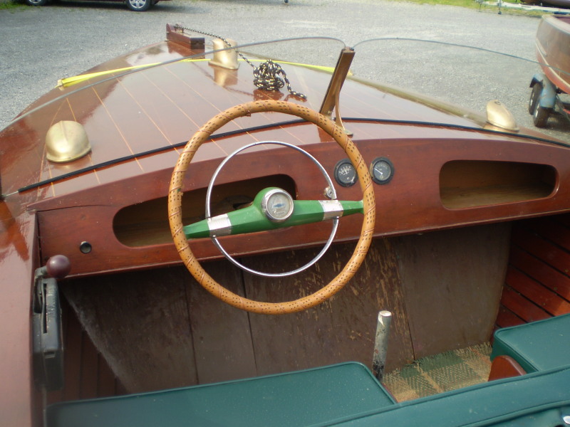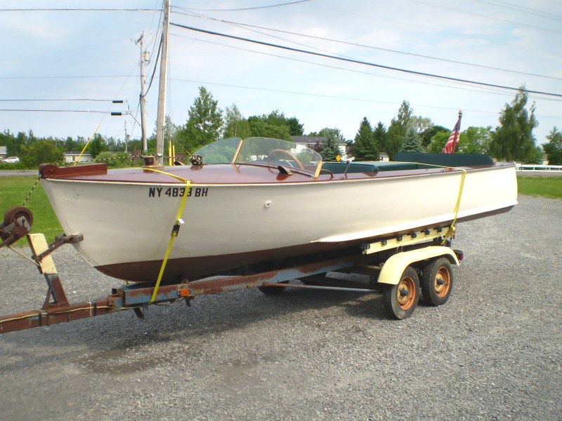 This is a cedar planked, Alexandria Bay built boat...by an unknown builder. She is of low freeboard (excellent for fishing) and utility design. Nice upholstery, functional design and style. In fairly good shape, in the water this year. Engine runs well, no trailer. Nice brass hardware.
