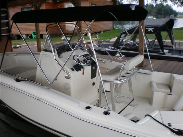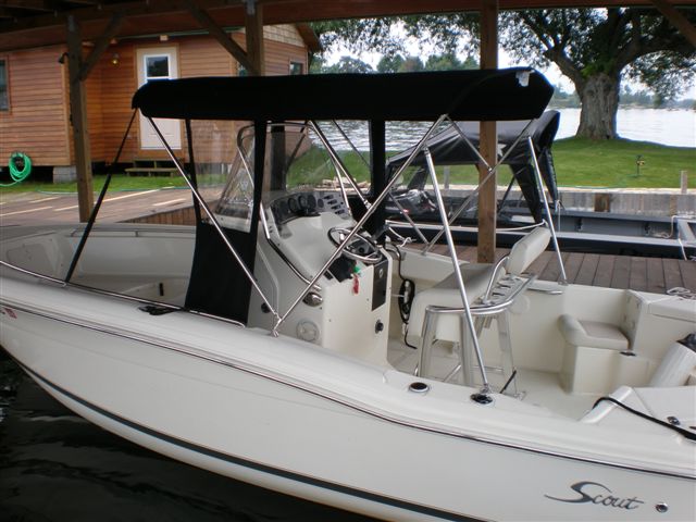 Here is a pristine Scout with a Yamaha four-stroke 150 and a Load Rite tandem trailer. Full walk-around center console with custom cover. This is a wonderful clean fish or ski boat...for the whole family. Perfect trailer with brakes and bearing buddies. This is a clean, good looking family boat. Loads of extras; two props, anchor & line, custom canvas, In our showroom now!!!