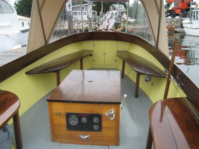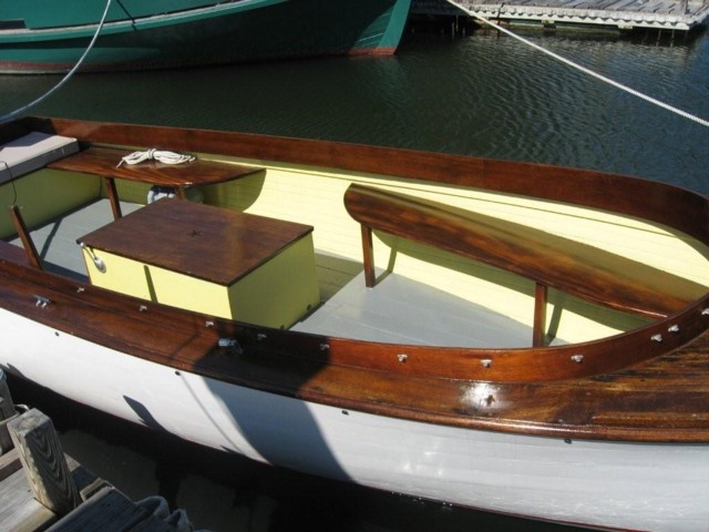 Built in 1933-34 at Tenants Harbor, Maine as tender for a new yacht. Designer, builder and owner unknown. Hull is fully sound, white cedar over steamed oak ribs. Deck, coaming and seats highly finished mahogany. No rot, no cracked ribs, and, after swelling, no leaks. 28 hp Kubota/BetaMarine diesel has 180 hours. (2004). 18 gal stainless tank. Averages about 1/3 gal/hr each season. Stick tiller starboard amidships, installed backward but one gets used to it. All hoses, thru hull fittings, exhaust w/baffle, wiring re-done when diesel installed. (Receipts available). Full canvas dockside cover plus removable spray top, two years old. Rear decking and main deck frame replaced last year. She is a most stable platform in a lumpy sea and cruises 12-14 knots with 3-4 adults aboard. Price includes new, 20' twin axel custom flat bed trailer fully rigged. Boat fully equipped. A real head turner in Mystic, CT.