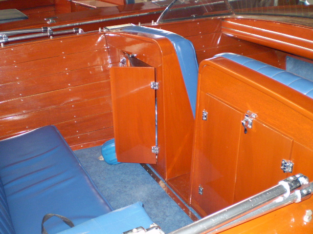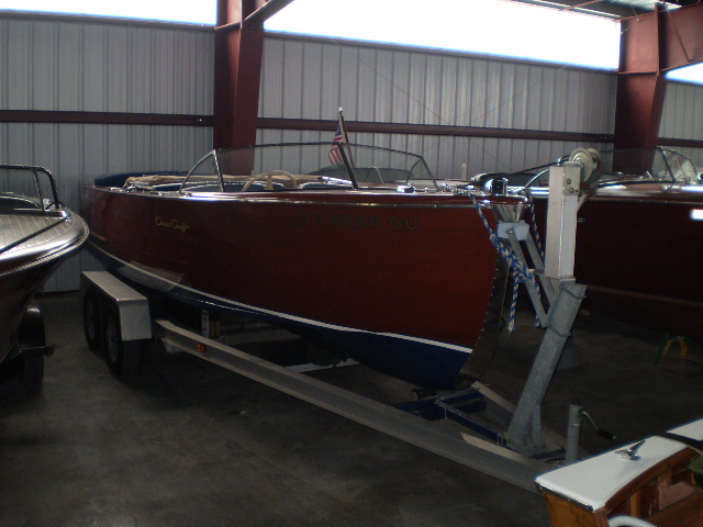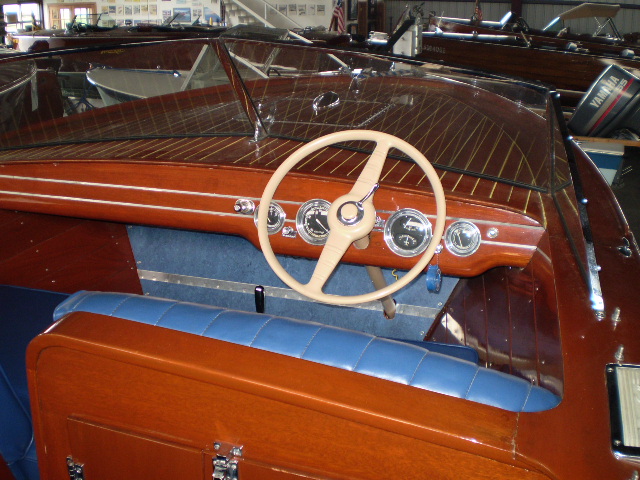 This is a Sportsman like you have never seen before...third seat added with walk-through to increase seating and entertaining ability. New convienence cabinets added for storage of refreshments or boating necessities. New brilliant blue interior sets the fresh varnish off very well. Exterior is faultless and mirror bright. West System bottom makes this a wonderful garage boat...in & out...no soaking up. Hardware is bright and beautiful, as well as correct. Flooring is correct and new also. Take a close look at this Sportsman and you will see the difference. This is a turn key entertainment center. The third seat makes this boat a showpiece. Powered by a newer 185hp Chris Craft V8 engine. Comes with aft cover, lines, and fenders.