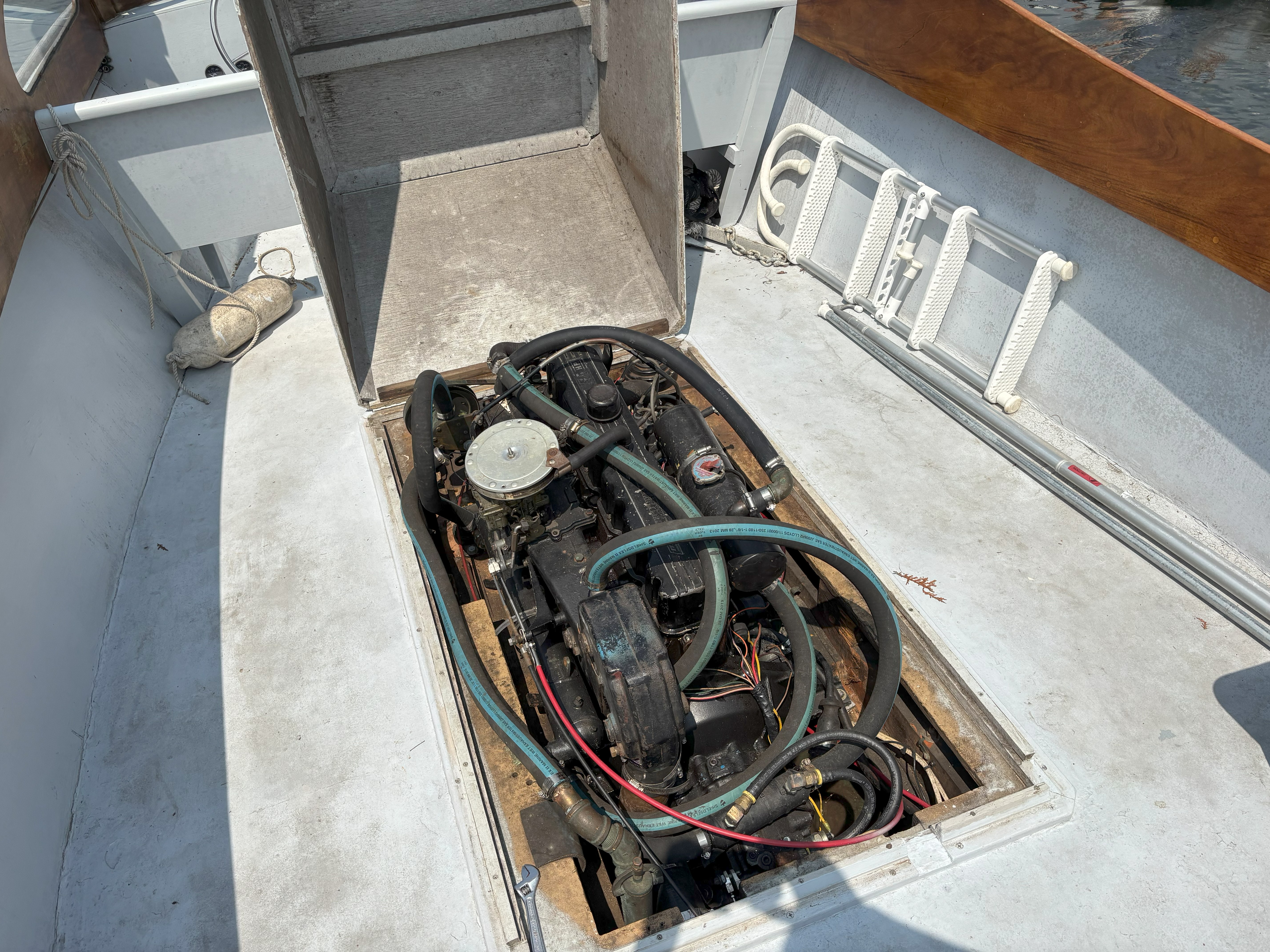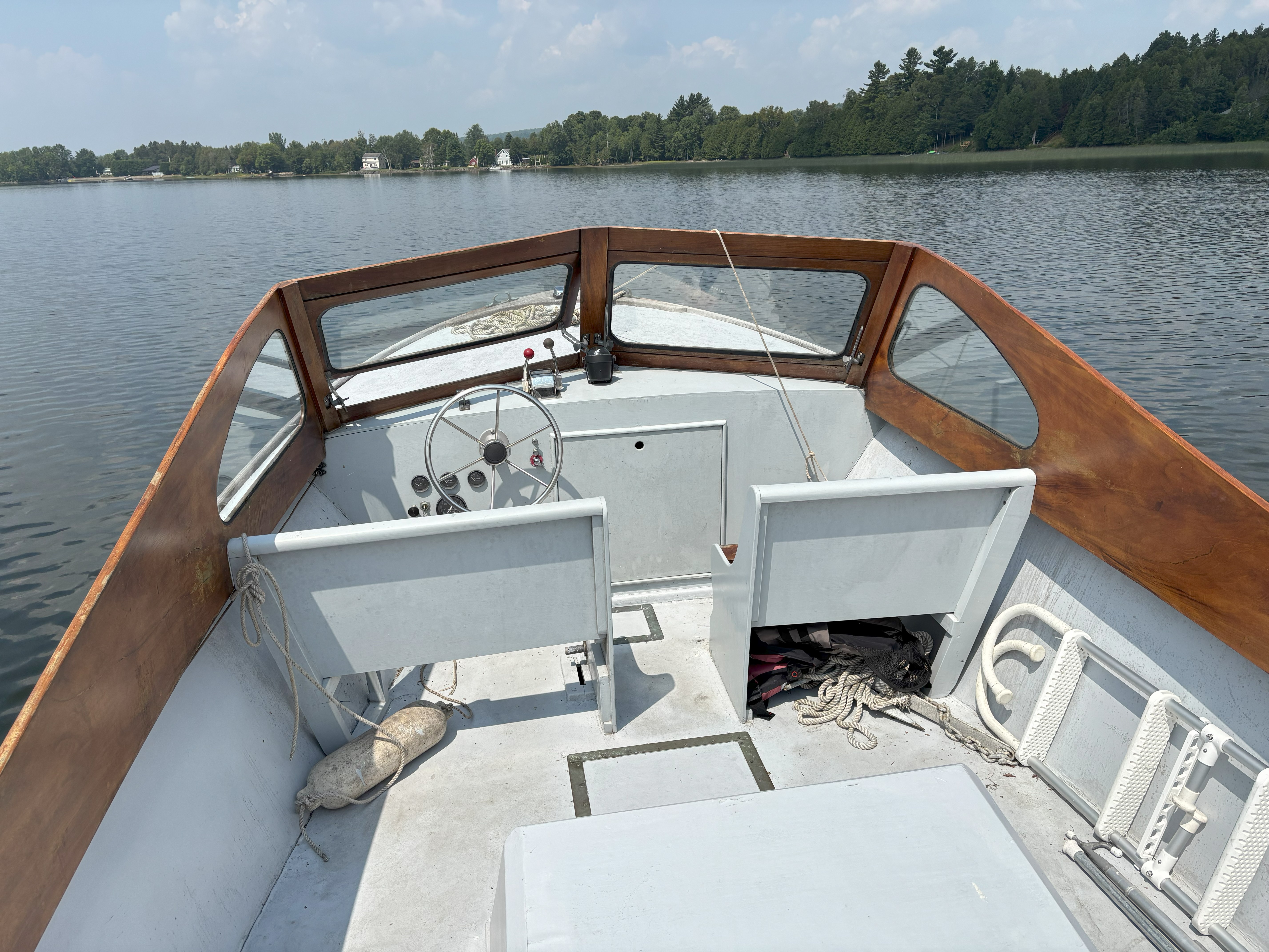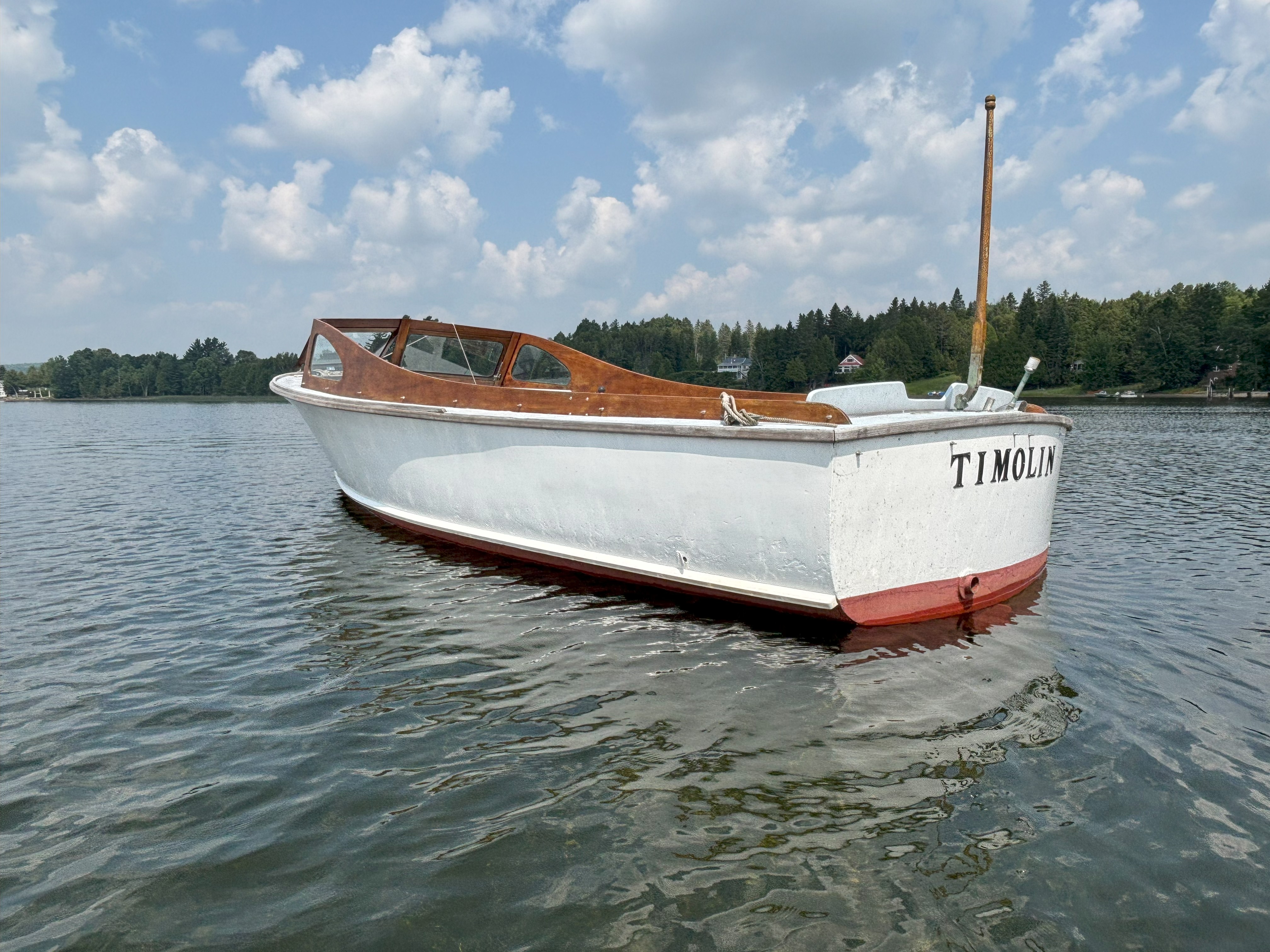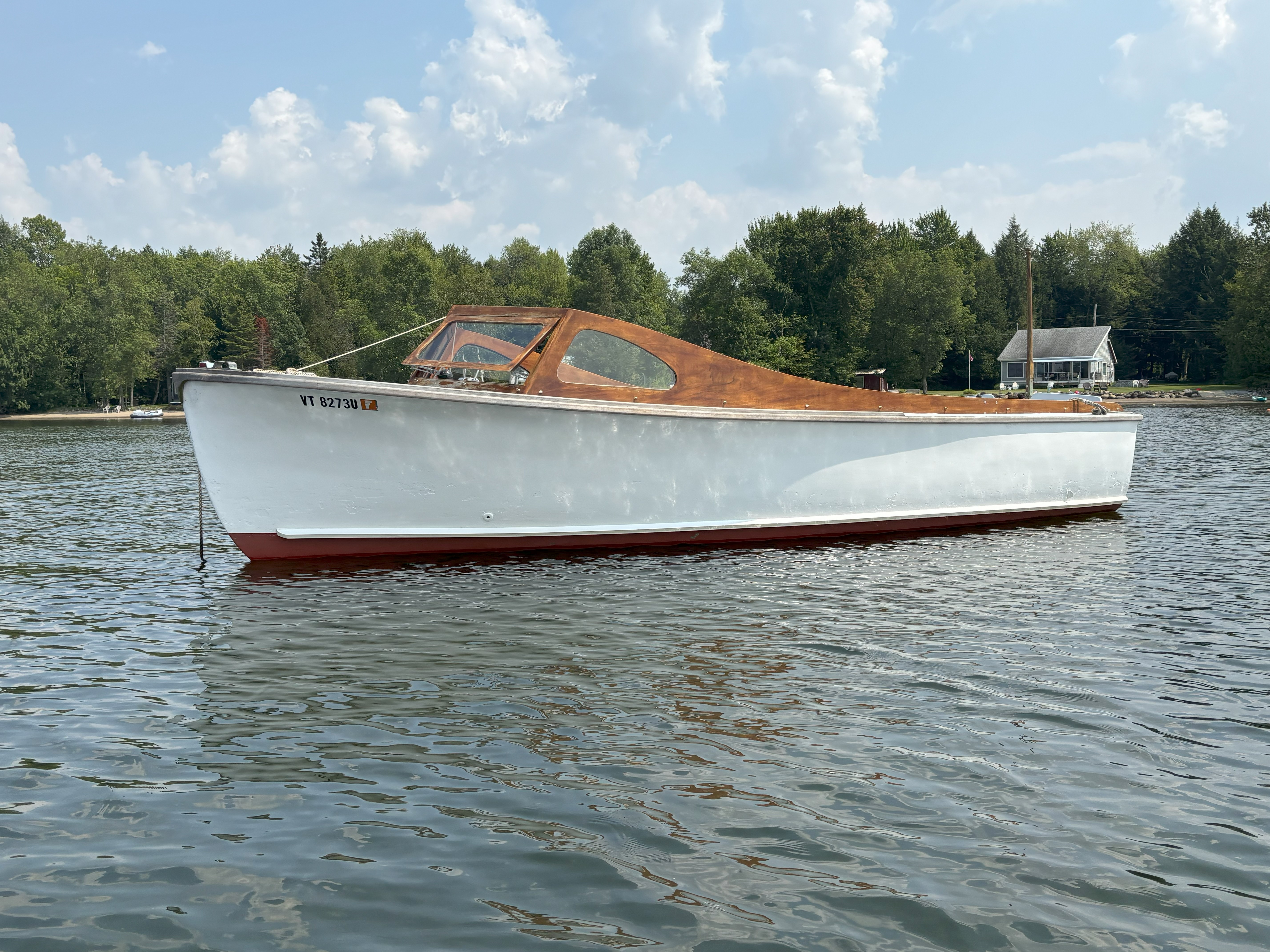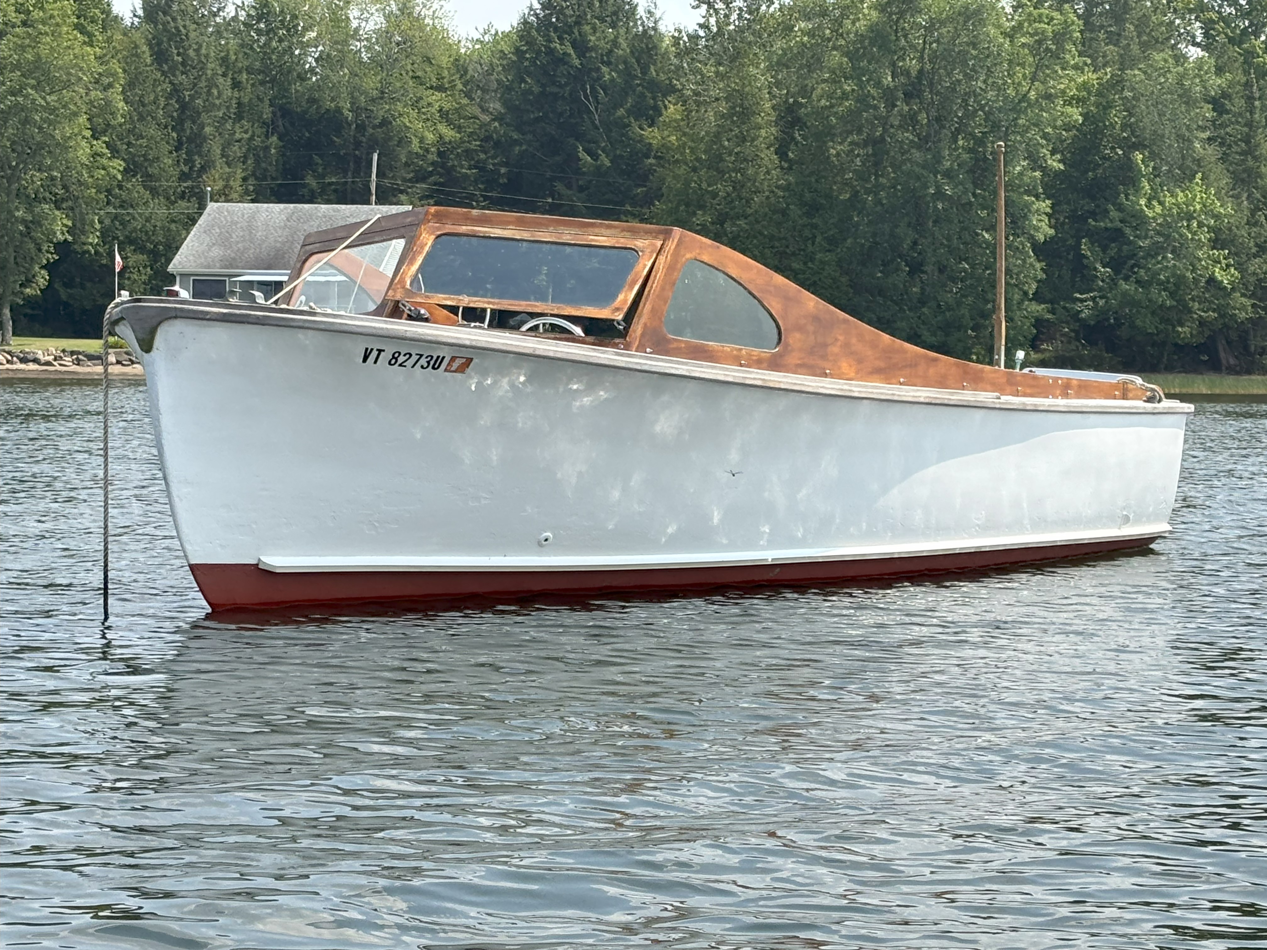 Family owned and located on Cape Ann (MA) for 45+ yrs.; recently re-powered w/Mercruiser inline 6 cyl and Borg Warner Velvet Drive; closed system cooling; Fore (wheel) and aft (tiller) steering w/Morse power controls; 2nd generation mahogany and teak; fiberglass hull is precursor to present day Tripp 22 Bass Boat; Calkins trailer included; video (1-2 min) available; located in central Vermont.