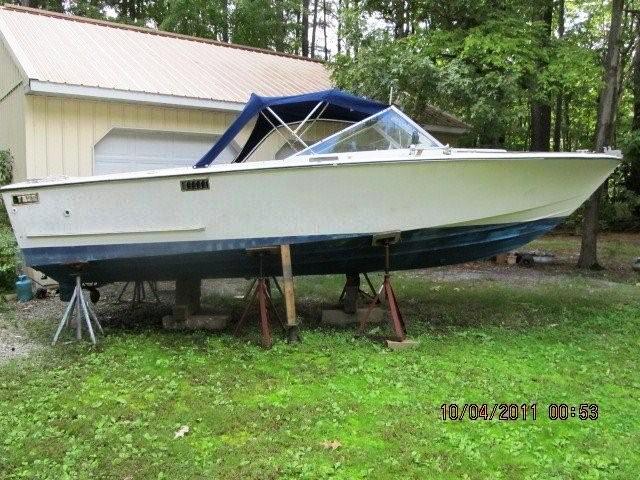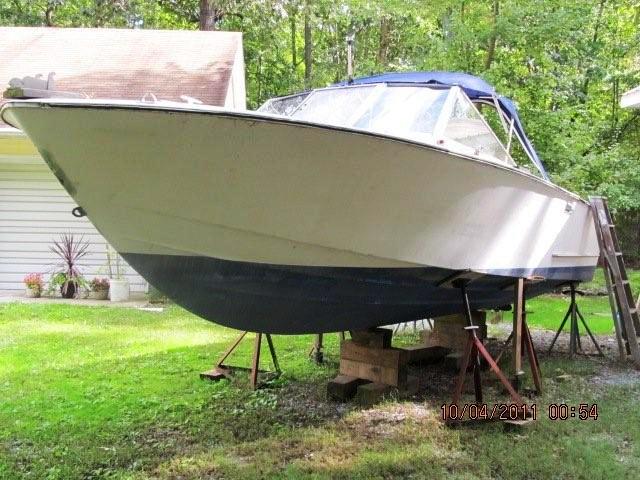 Boat has nice hull-no soft stuff-needs front sliding hatch replaced/repair and deck in that area. Engine is a 350/260 HP FWC Mercruiser, 316 hrs since rebuild-much equipment-boat in running shape, winterized for winter, no trailer, could be rolled on a suitable roller trailer-buyer bring help-none here-boat is covered with tarp for winter. Clear MD title. Sounder, auto pump, ladder, anchor, lines, boat hook, jackets, dual batteries, blower, compass, bimini top, fenders etc.