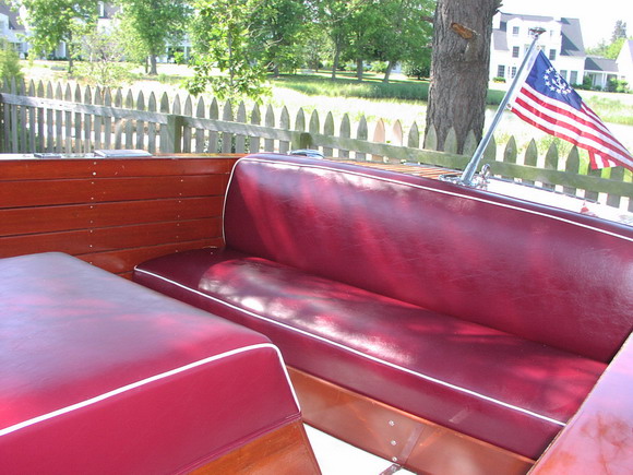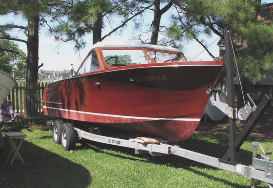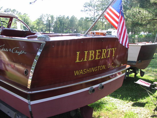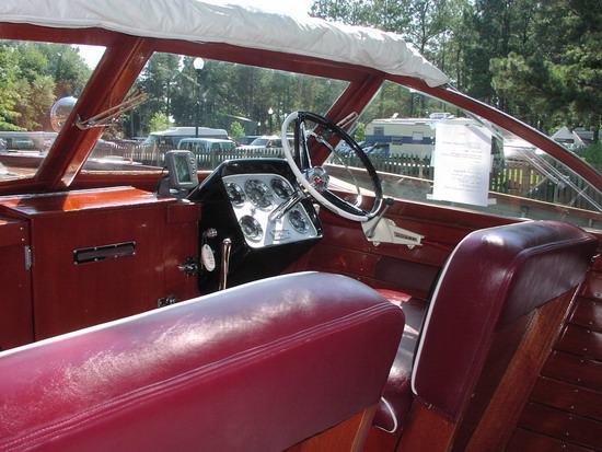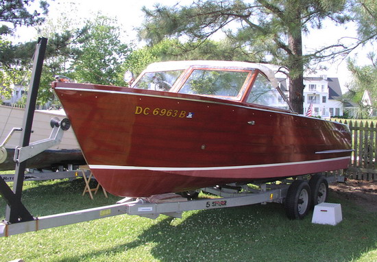The 24’ Sportsman was designed and built as a big-water boat that shares the style and “pizzaz” of her mahogany runabout and utility cousins. She’s heavy (over two tons) with plenty of freeboard and flare so she’ll get you home in difficult conditions. Even though she’s big, she’s got plenty of speed with a 185 hp Chris-Craft V8 that will push her over 30 knots: plenty fast for waterskiing, wakeboarding, or tubing. And she’s an ideal boat for entertaining: her huge cockpit can accommodate ten guests for cocktails or a barbecue. "Liberty" comes with a bimini, a full weather cover, and a heavy duty trailer. She is restored in excellent structural and mechanical condition, however cosmetically she is only fair (the reason for her reduced price).