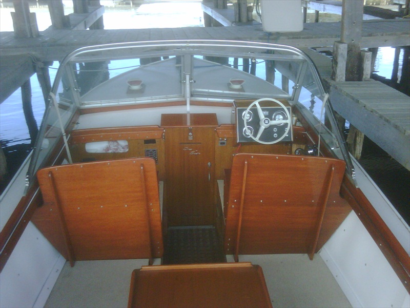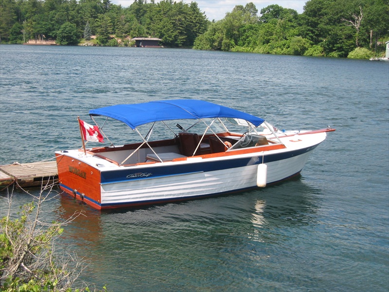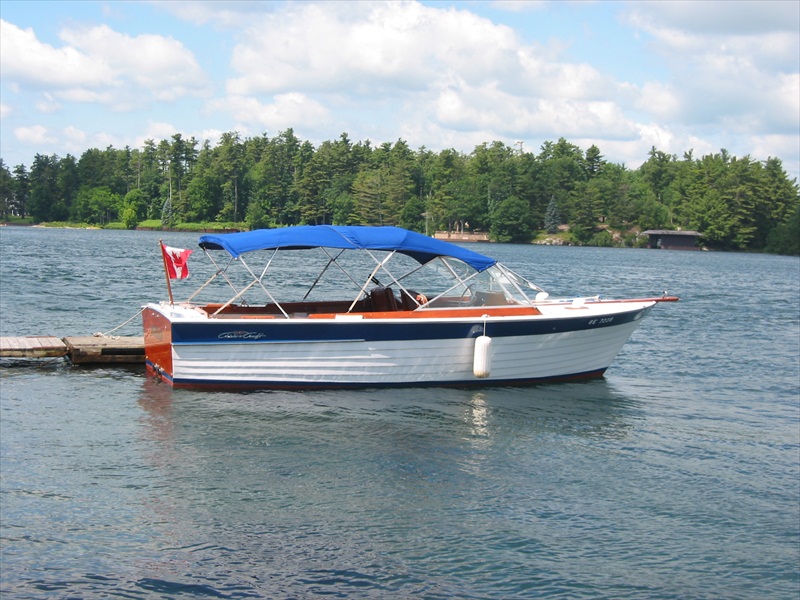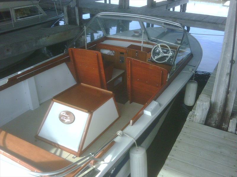 Great river boat, stable, dry comfortable ride. Turnkey boat ready to use. Restored hull, decks, floors, seats, engine box & all mechanicals. New GM 350 crate engine 260 HP, electronic ignition with 45 hours, new: Dyna Jet prop, stainless steel shaft, skeg bearing, alternator, engine & exhaust hoses & fiberglass mufflers, electronic tach, new full canvas top & side curtains, new Nautolex on decks & floors. Carburetor, water pump & Paragon transmission professionally refurbished. Planking and ribs repaired at water level both sides. Topside stern decks renewed. 2 new 1,000-amp batteries. new decks, new planks in bottom and all refastened with a new camper canvas in 2009.