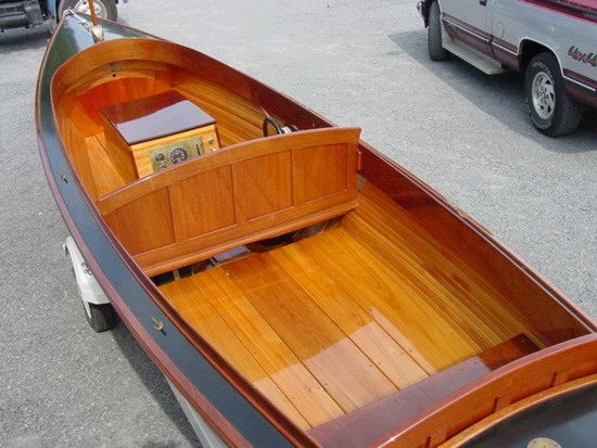 This reproduction of a 1904 launch was built in the Antique Boat Museum's stone building. It is constructed of Atlantic white cedar planking over oak frames. Copper and bronze fastened, mahogany coaming. Bronze hardware, strut, prop, rudder, and quadrant. Stainless steel prop shaft. Cedar floorboards, canvas covered deck, aluminum fuel tank. Powered by a modern, 3 cylinder diesel engine.