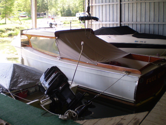 A classic Chris Craft fishing boat. Original engine, is used daily for family cruising. Fresh Varnish, painted hull, canvas cabin top needs attention. Only 136 of these produce in the two years of production. An excellent St. Lawrence River boat...in nice shape. Boathouse stored.