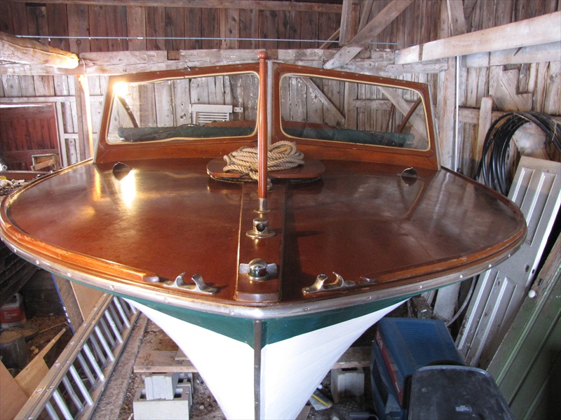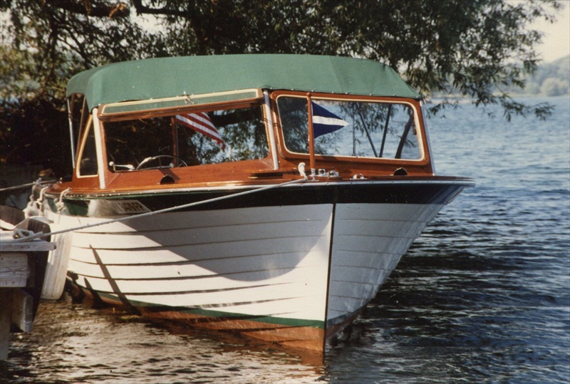Boat was completely re-fitted and re-powered about 1985 by Morgan Marine of Silver Bay NY (now Hacker boat co). I acquired it from that owner, a friend, in 1989 and operated it on the St. Lawrence river until 1996 when it sprang a leak. It still has a bad board mid aft and has been in my barn ever since. Otherwise in very good shape and will again be an excellent boat when fully restored. Paint, brightwork still very good. Matching cushions and top. Photos in barn as it now is and in River mid-'90s.