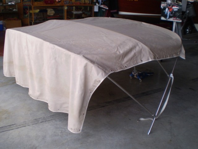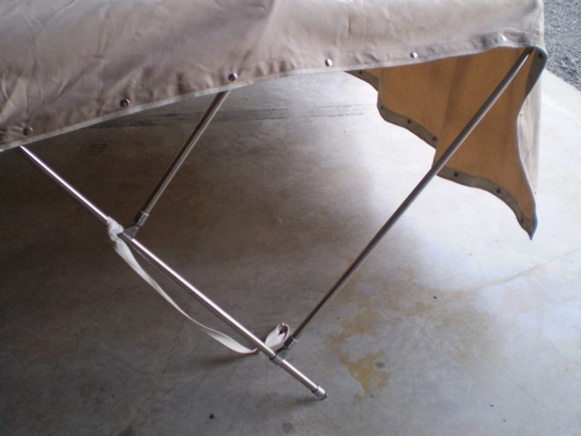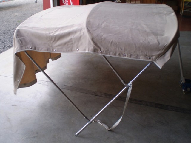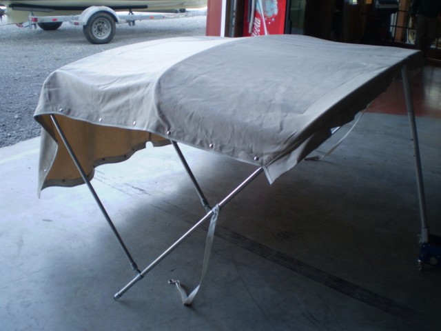 This is a top taken from a 25' Lyman. It is very new and has had very little wear. It appears to be SunBrella fabric. It is 100" wide and designed to cover from the windshield to behind the helm seats. Stainless steel hardware and ultimately adjustable to fit your boat. A very good buy.