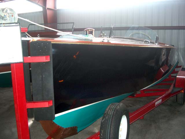 This rare Canadian Beauty was built by Louis Follmer and Leo Tassier At Les Cheneaux in 1926. She has a 6'10" beam and a 23" draft and was built as a runabout then remodelled by Tassier in 1953 as a utility. The original power was provided by a 50HP Kermath. She now sports a Chrysler Marine 155HP that really moves her along! She is 1 of 2 remaining of a production of seven hulls that year. In 2005 she received a total comprehensive restoration sparing no expense. The gloss black hull sides are mirror like and her white stripped mahogany decks and interior are fabulous. Also the recent forest green cushions only enhance her beauty. The flooring is also new Nautilex in brown with black stripping. She sits on a beautiful custom tandem trailer made just for her! The "nubs" are still on the tires!