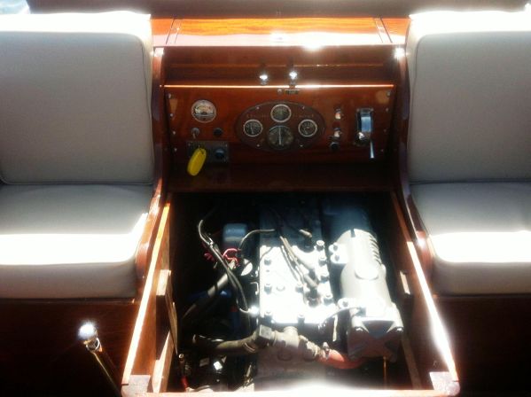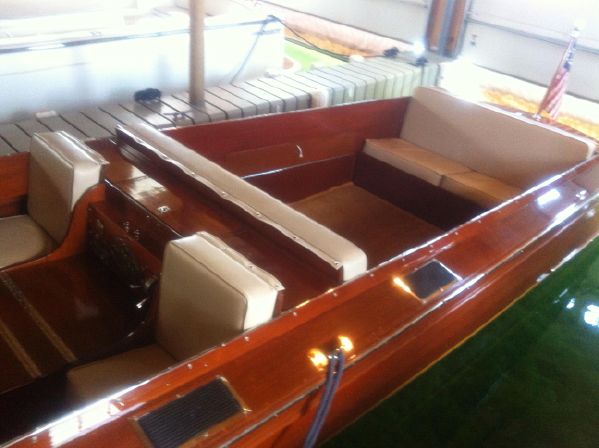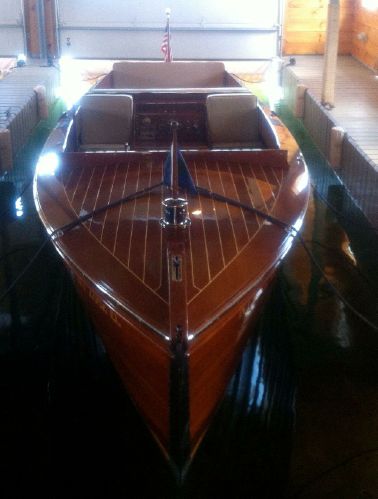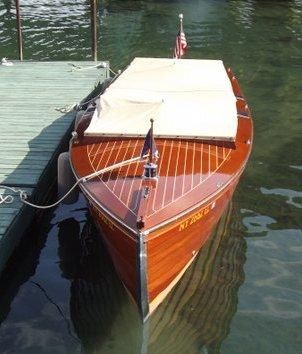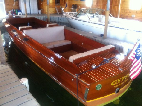 A classic St. Lawrence River side steer Guide Boat. It has undergone an extensive restoration including new upholstery, new fuel lines, fresh exterior varnish, engine overhauled, and all new interior varnish and fresh bottom paint. The hardware is a great shape and the boat is striking as it glides through the waters of the St. Lawrence River. These boats with the unique side steer were originally Guide Boats used for taking paying customers or "Sports" as they were known fishing in the 1000 Islands. The guide would sit bin the front part of the boat with the "sport" in the back that he/she would not get wet and with a divider between them which usually was a ice box/ bait well. These boats handled very well and were able to easily operate in shallow water and are a signature piece of the 1000 Islands.