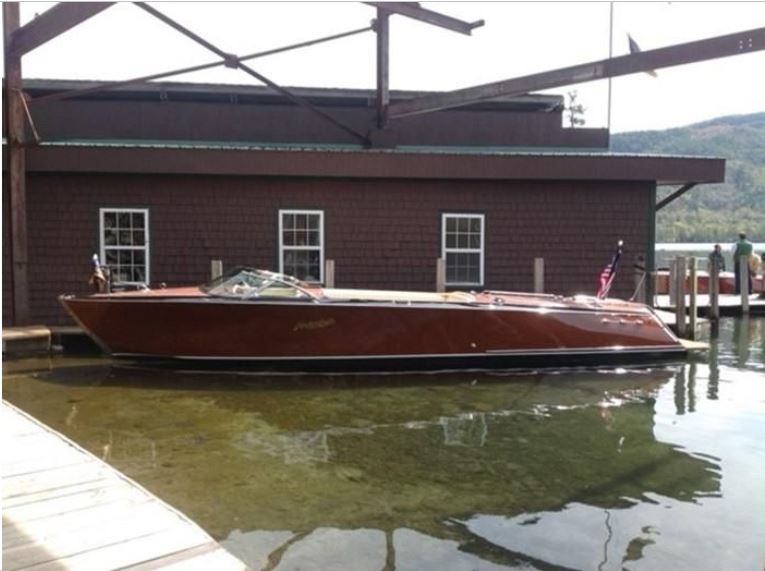 One of the most popular models of the Lake George produced boats are the "Sport" version. This model offers a walk through to an extended second cockpit which provides the boat owner with lots of room for entertaining and socializing while underway. The windshield is also unique as it is a lower profile offering a sleek look. Also with this model are the aft steps which allow for easy access to the water for entrance and egress. This model has received a restoration recently at the factory and is being offered now due to a lifestyle change by the seller. The boat has been very lightly sued with only 125 hours on the engine. The cream colored upholstery, chrome and finish are all in excellent condition and the boat requires only a new owner.