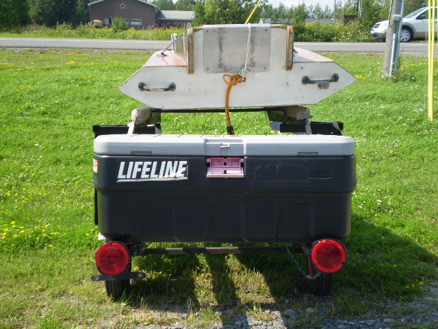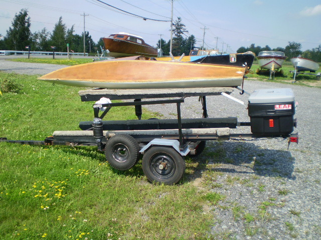 This trailer carries 2 small outboard hydros or runabouts easily. It is in solid shape and comes equipped with a spare tire and a storage box on the back to hold your equipment. Runabout shown in the photos is listing #28181.